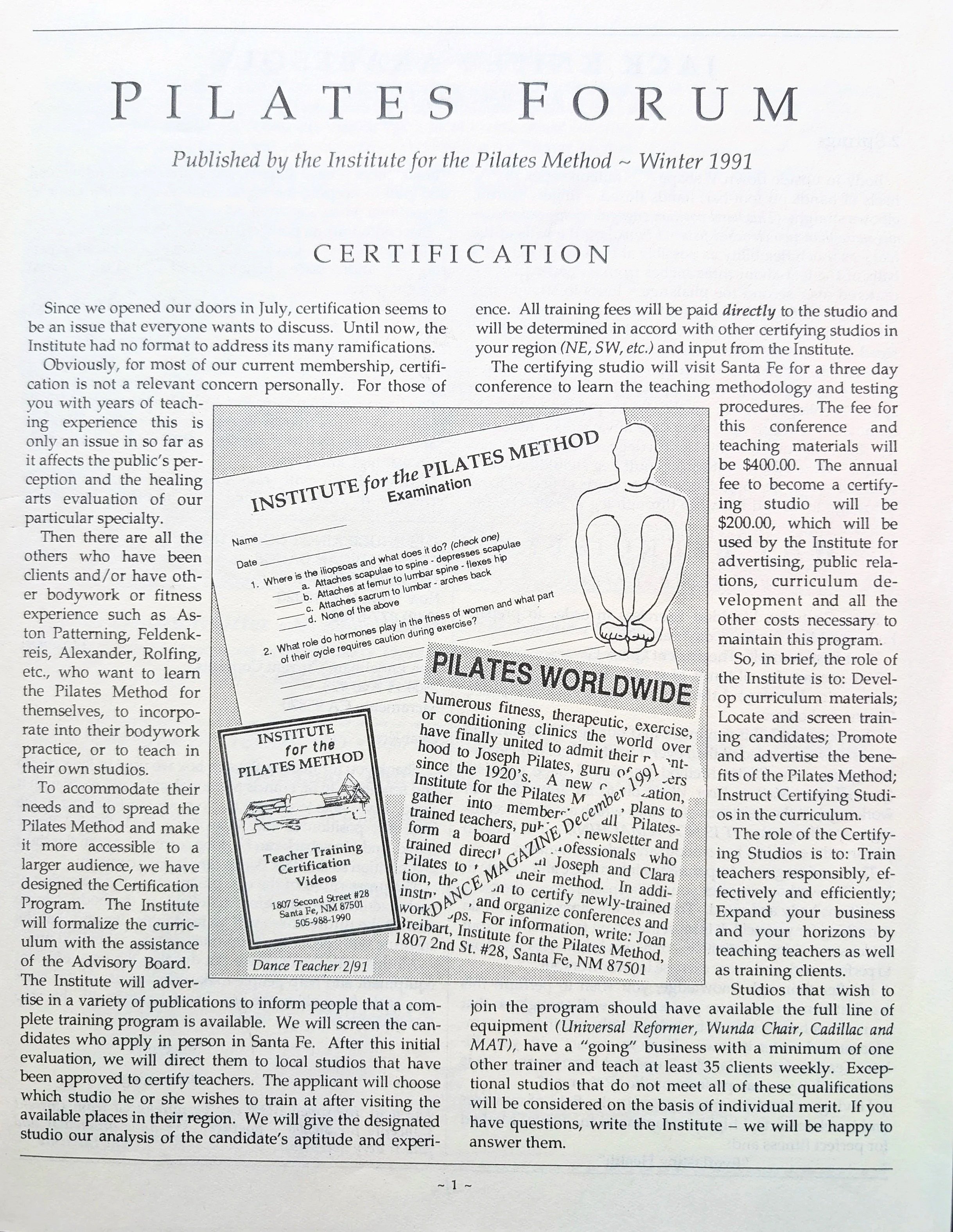 In 1991 the Institute for the Pilates Method released the first Pilates newsletter featuring articles by Even Gentry, Michele Larsson, Joan Breibart and more.